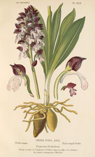 Trváca orchidea s byľou vysokou 30-90 cm, pod súkvetím niekedy purpurovo sfarbenou; dolné listy obrátene podlhovasto vajcovité, svetlozelené a zvrchu lesklé, v prízemnej ružici; súkvetie hustý, bohatý klas dlhý 6-15 cm, spočiatku kužeľovitý, neskôr široko valcovitý, kvety veľké, okvetné lístky tvoriace krátku prilbu tmavo hnedopurpurové s tmavšími bodkami a čiarami, zvnútra zelenkasto bledé, slabo bodkované, hlboko trojlaločný belavý, príp. svetlo červený pysk do 2 cm, bočné laloky úzko čiarkovité, stredný postupne sa rozširujúci od bázy, na konci srdcovito vykrojený do 2 širokých dielov s malým zúbkom uprostred, ostroha je valcovitá, tupá, na konci zhrubnutá; plodom je tobolka s množstvom semien